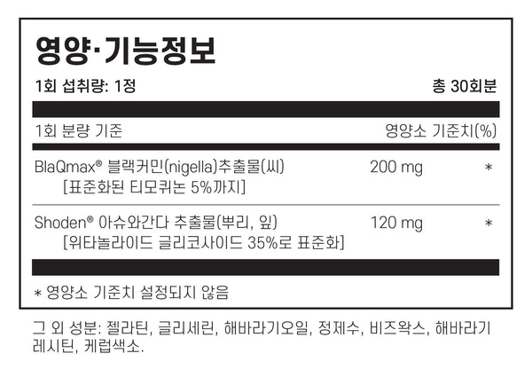 표준화되고 임상적으로 연구된 아슈와간다와 블랙 큐민 추출물 함유