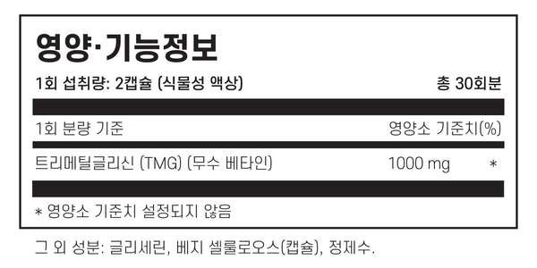 트리메틸글리신(TMG)은 특히 심장건강과 관련하여 건강한 심혈관 기능을 촉진하기 위해 건강한 호모시스테인 수치를 지원합니다. TMG는 호모시스테인 수치에 긍정적인 영향을 미침으로써 몸 전체의 여러 시스템을 서포트하여 건강 유지를 돕습니다.
