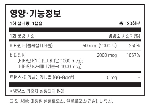 비타민D 시너지™(Vitamin D Synergy™)는 체내에서 자연적으로 생성되는 화합물인 제라닐게라니올(GG)과 함께 비타민 K1과 K2(MK-4)로서 비타민 D3와 비타민 K를 목표량만큼 제공하여 최적의 뼈구성을 촉진하는 데 도움을 줍니다. 심장 건강을 유지하고 적절한 면역 체계 균형을 유지합니다.