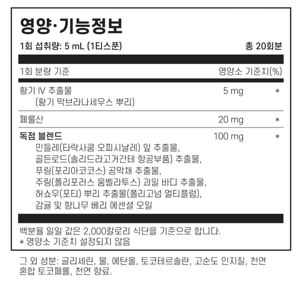 복용방법 : 하루에 1 티스푼(tsp)씩 복용, 삼키기 전 30초 이상 혀 밑에서 흡수될 수 있도록 입에 머금고 있다 삼키세요. 원하는 복용량만큼 반복하거나 의료 전문가의 지시에 따라 반복하십시오. 식사 최소 10분 전 공복에 섭취하는 것이 가장 좋습니다. 임신, 수유 중이거나 임신을 계획 중인 경우에는 사용 전 담당 의사와 상담하세요.