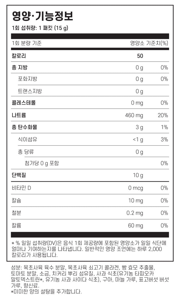배어 본스는 단백질과 신체에 필요한 수분을 공급하고 설탕은 전혀 첨가하지 않은 사용하기 쉬운 인스턴트 파우더 믹스로 맛있고 영양이 풍부한 본 브로스를 제공합니다.