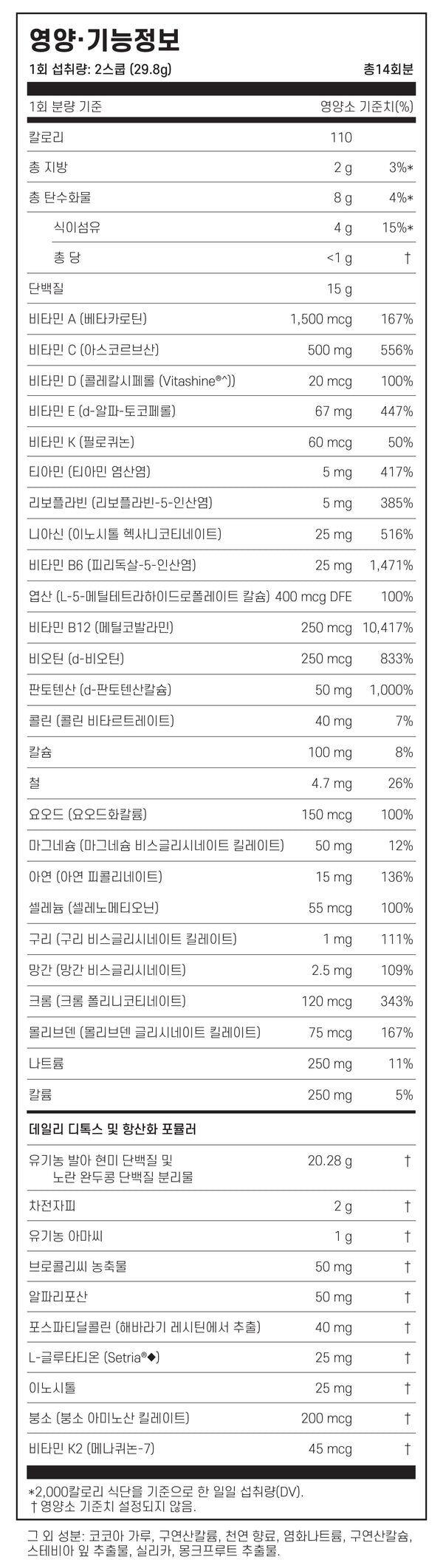 많은 단백질 보충제가 단백질만 제공하는 반면, 당사의 Daily Nutritional Support는 신체가 최상의 기능을 발휘하는 데 필요한 권장 미량 영양소(비타민과 미네랄)를 신중하게 배합한 양으로 제공합니다. 이 강력한 영양 블렌드에는 건강한 피부와 뼈를 촉진하고, 단백질 합성을 지원하고, 필수적인 일상 기능을 지속적으로 유지하고 수행하는 데 도움이 되는 유익한 항산화제도 포함되어 있습니다. 많은 비타민은 신체가 흡수하고 효율적으로 활용하기 가장 쉬운 활성화되고 메틸화된 형태로 제공됩니다. 전해질 블렌드가 추가되어 에너지를 높이고, 수분 공급을 지원하고, 일일 해독을 최적화합니다.