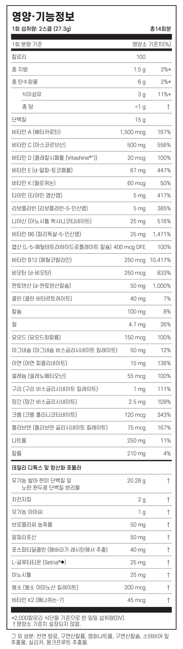 많은 단백질 보충제가 단백질만 제공하는 반면, 당사의 Daily Nutritional Support는 신체가 최상의 기능을 발휘하는 데 필요한 권장 미량 영양소(비타민과 미네랄)를 신중하게 배합한 양으로 제공합니다. 이 강력한 영양 블렌드에는 건강한 피부와 뼈를 촉진하고, 단백질 합성을 지원하고, 필수적인 일상 기능을 지속적으로 유지하고 수행하는 데 도움이 되는 유익한 항산화제도 포함되어 있습니다. 많은 비타민은 신체가 흡수하고 효율적으로 활용하기 가장 쉬운 활성화되고 메틸화된 형태로 제공됩니다. 전해질 블렌드가 추가되어 에너지를 높이고, 수분 공급을 지원하고, 일일 해독을 최적화합니다.