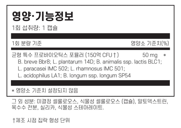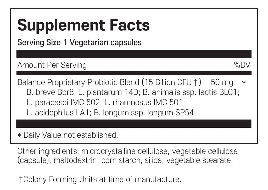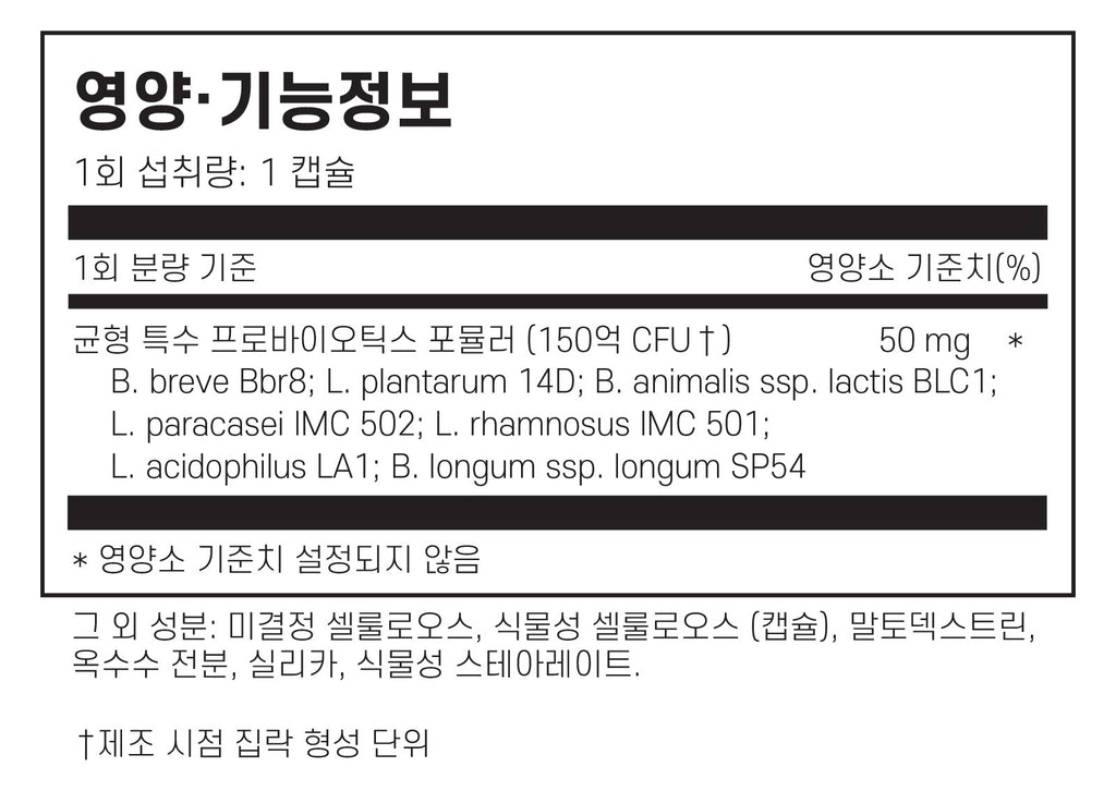 플로라시스트® 프로바이오틱스 균형은 7가지 프로바이오틱스 균주를 함유하고 있습니다: B. breve Bbr8; L. plantarum 14D; B. animalis ssp. lactis BLC1; L. paracasei IMC 502; L. rhamnosus IMC 501; L. acidophilus LA1; B. longum ssp. longum SP54. 이 7가지 프로바이오틱스 균주는 캡슐당 총 150억 개의 콜로니 형성 단위(CFU)를 함유하고 있습니다.