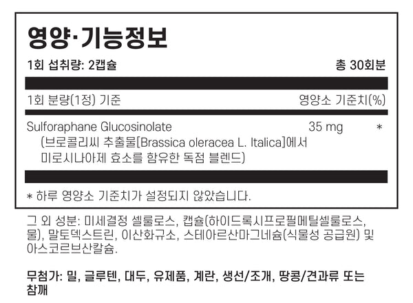 - 표준화된 브로콜리 추출물(1회 제공량당 설포라판 글루코시놀레이트 35mg)