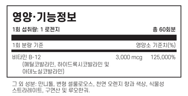 - 1회 제공량당 3,000mcg의 비타민 B12(메틸코발라민, 하이드록시코발라민 및 아데노실코발라민) 함유