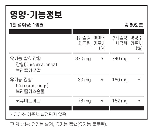닥터 머콜라의 유기농 발효 강황은 두가지로 구성되어 있습니다.  최소 95% 쿠르쿠미노이드로 인증된 유기농 강황 추출물이 함유되어있고, 흡수력 향상을 위해 유기농 발효 강황을 함유 하고 있습니다.