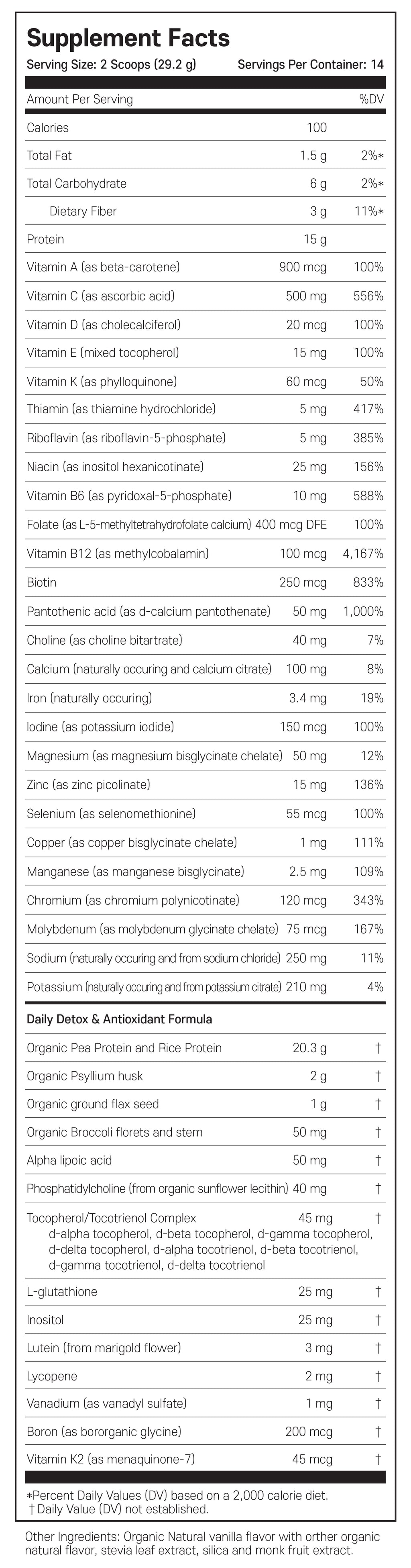 비타민, 미네랄, 단백질, 전해질, 항산화제를 한곳에서 제공하는 이 파우더는 Dr.Cabral Detox의 핵심입니다. 15g의 비건 단백질이 함유된 일일 영양 지원은 신체가 독소를 제거하는 동안 신체에 꼭 필요한 에너지와 영양을 제공합니다. 일반 단백질 쉐이크보다 훨씬 더 많은 일일 영양 지원에는 해독 과정을 시작하는 중요한 화합물도 포함되어 있습니다. Dr.Cabral Detox는 신체가 고갈되도록 두지 않고 신체가 해독을 시작하면서 비타민과 미네랄 수치를 다시 채우고 회복하기 시작합니다.