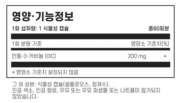 *해당 제품의 병 내부는 인돌-3-카비놀 성분으로 인해 다소 핑크색으로 물들어 있을 수도 있습니다. 해당 현상은 정상 제품의 자연스러운 현상으로 캡슐 성분에는 전혀 영향을 주지 않습니다. 모든 캡슐은 엄격한 기준에 따라 제 3자 검수기관에서 품질 및 안정성 테스트를 통과하고 출시됩니다.
