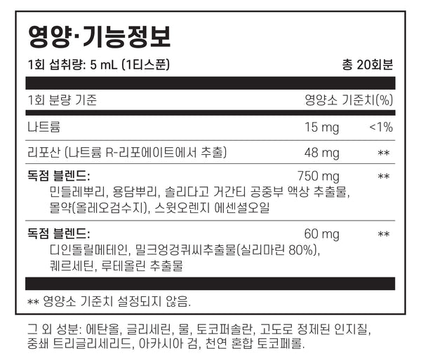 밀크엉겅퀴 추출물, 민들레 뿌리, DIM, 항산화제 + 간 해독을 지원하는 식물성 성분이 함유된 액체 간해독 서포트 보충제.