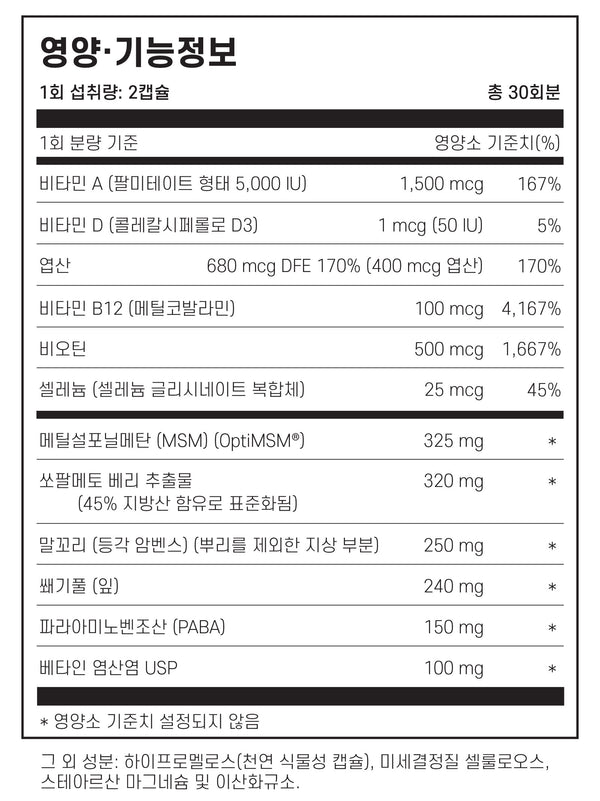 필로소피 모발 피부 손톱 에센셜은의 각 제공량에는 베타인 HCl 100mg, 쏘팔메토 320mg 및 MSM 325mg이 포함되어 있습니다. 비타민 A, 비타민 D3, 엽산, 비타민 B12, 비오틴 및 셀레늄의 추가 지원은 피부, 머리카락 및 손톱의 전체 범위를 지원합니다.
