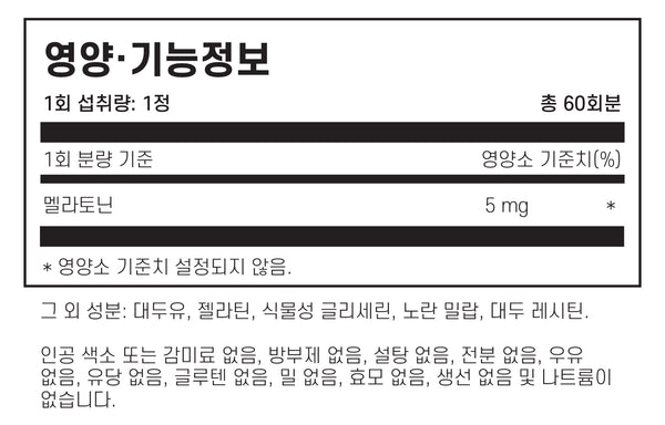멜라토닌 5mg이 포함된 제품으로 긴시간 숙면상태를 유지하는데 도움.