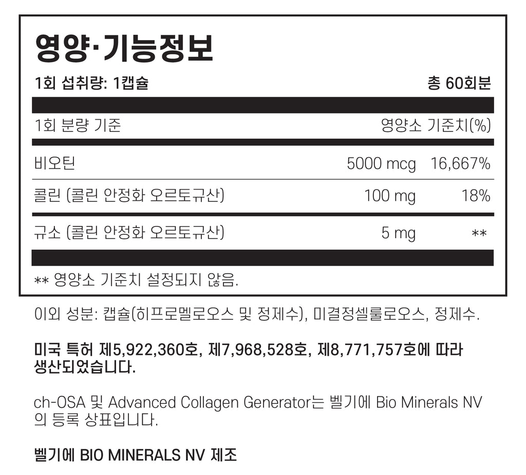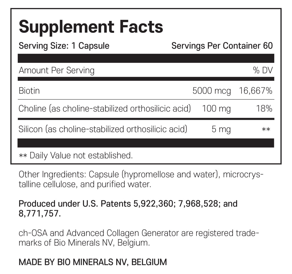 수년 동안 OSA(오르토규산)는 잠재적인 콜라겐 생성 물질로 여겨져 집중적인 연구 대상이었습니다.  이러한 연구를 통해 ch-OSA라는 분자 복합체가 개발되었습니다.  콜린은 OSA와 필수적인 결합을 형성하는 양전하를 띤 질소 원자를 가지고 있을 뿐만 아니라, 저명한 콜라겐 연구자들에 따르면 오르토규산을 표적 세포로 운반하여 콜라겐 생성에 관여하는 경로를 활성화합니다.  임상 시험 결과, ch-OSA는 콜라겐 생성 능력 외에도 피부 탄력과 모발 강도에 도움을 주는 케라틴과 엘라스틴 생성을 촉진하는 것으로 나타났습니다.