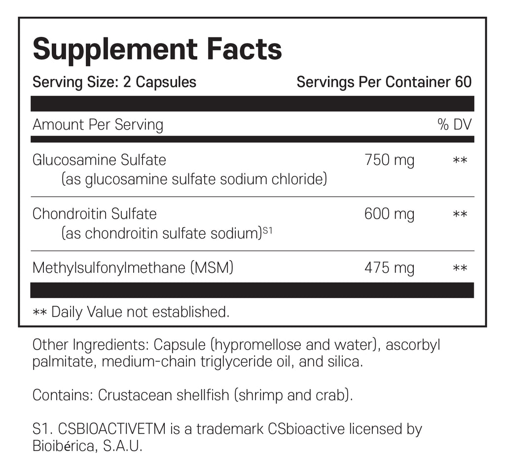 콘드로이틴 황산(CS)은 체내에서 가장 풍부한 글리코사미노글리칸(GAG)입니다.  GAG는 연골과 관절액의 주요 구성 성분입니다.  CS는 체내 GAG 합성을 촉진하고 다른 관절 GAG의 분해를 막아 관절 건강을 증진하는 것으로 알려져 있습니다.  CS를 경구 투여(800~1200mg/일)하면 슬개골 압력에 대한 뇌 반응, 관절 간격, 관절 편안함 및 관절액 축적에 긍정적인 영향을 미치는 것으로 입증되었습니다.  SynovX Recovery는 권장 복용량인 하루 4캡슐에 1200mg의 CS를 제공합니다.