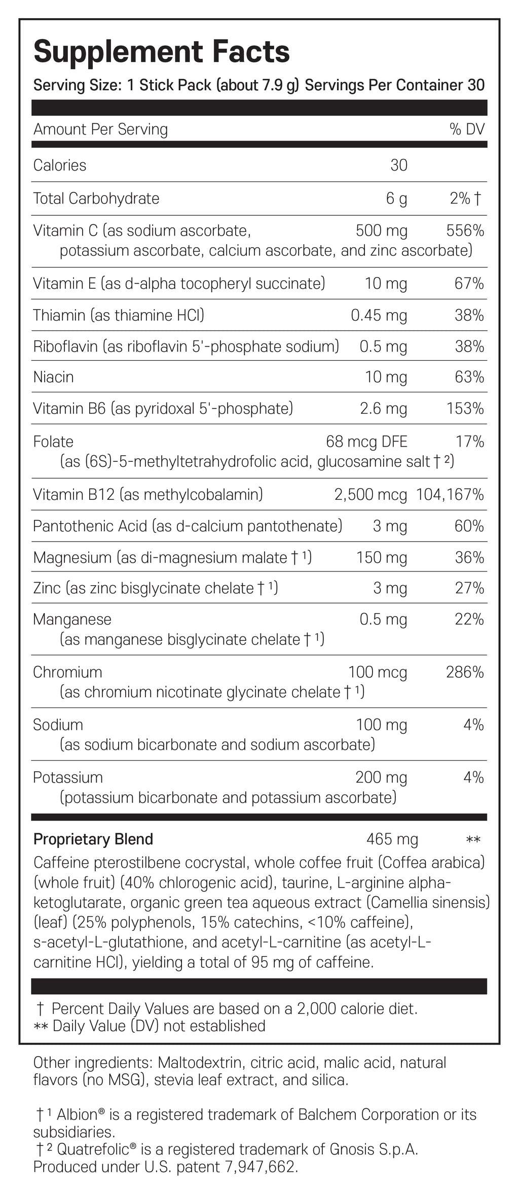 이 전해질 파우더는 비타민 B, 아미노산, 미량 미네랄, 항산화 영양소를 결합하여 건강한 에너지 레벨을 유지하고 산화 스트레스를 완화합니다. 또한 카페인-프테로스틸벤 공결정이 함유되어 카페인의 효과를 지속시켜 더욱 부드럽고 오래 지속되는 경험을 선사합니다. 탄수화물 함량이 7g에 불과한 이 전해질 드링크 믹스는 활동적인 하루나 오후에 기운이 빠지는 분들에게 이상적입니다.