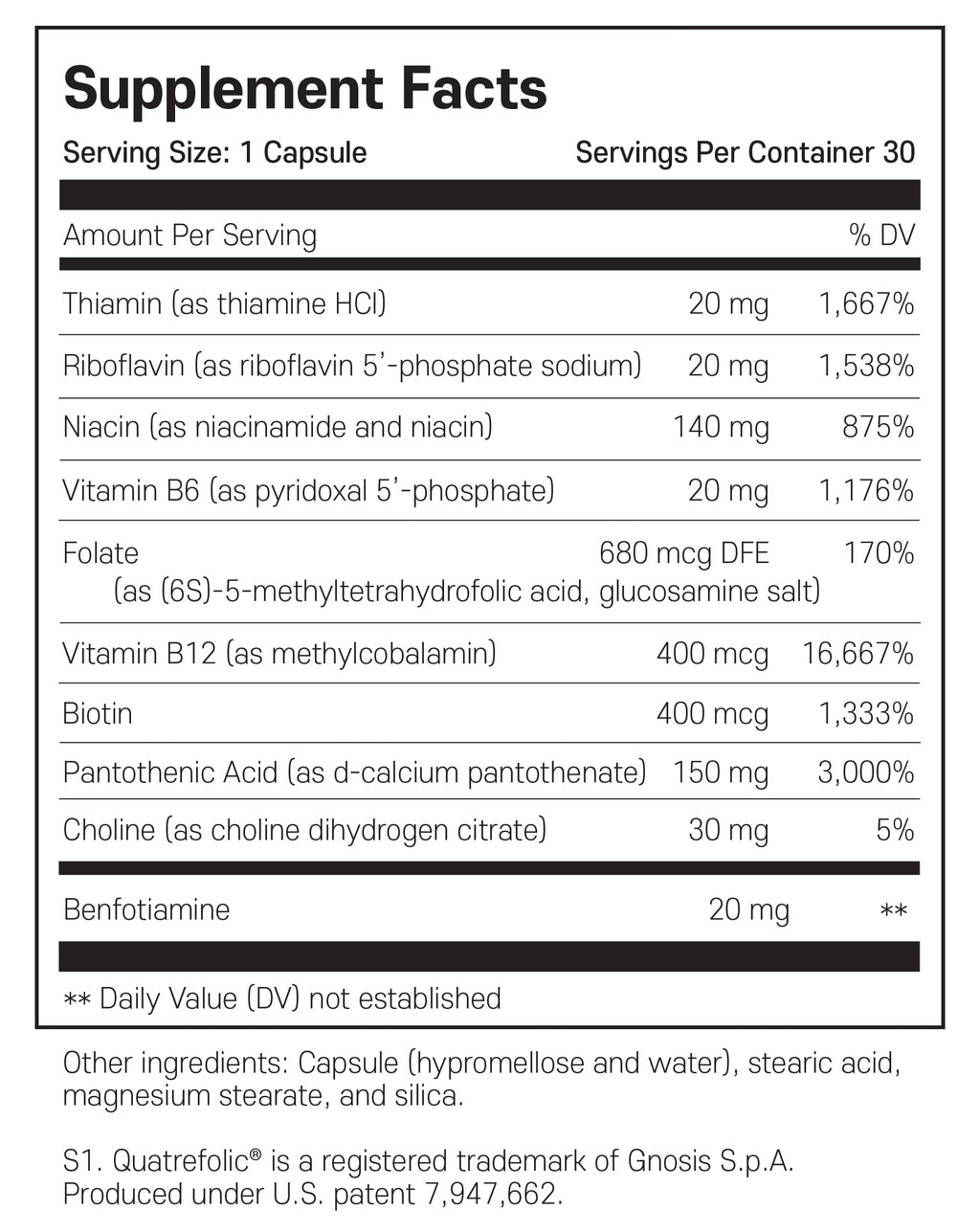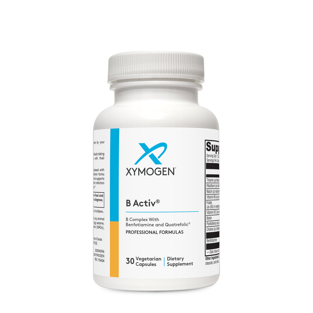 B Activ®은 부신, 신경계, 스트레스 관련 기능 지원을 위한 모든 비타민 B군을 함유하고 있습니다.  활성화된 형태의 비타민 B2, B6, B12, 지용성이며 생리 활성이 더 높은 티아민인 벤포티아민, 그리고 5-MTHF의 칼슘염 형태보다 안정성, 용해도 및 생체 이용률이 더 높은 것으로 입증된 콰트레폴리®의 엽산을 함유하고 있습니다.