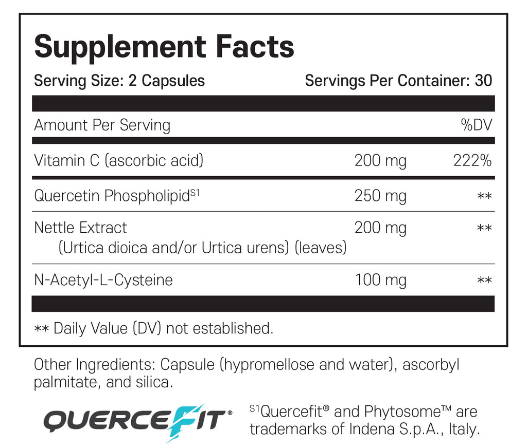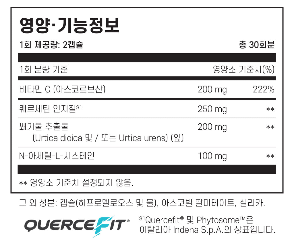 이 포뮬러에 함유된 Quercefit®은 코의 편안함과 호흡을 편안하게 유지하는 데 도움이 되는 경로를 활성화하는 동시에, 비타민 C와 NAC는 추가적인 항산화 효과를 제공합니다. 또한, 여러 세대에 걸쳐 사용되어 온 전통 허브인 쐐기풀 추출물이 이 포뮬러의 핵심을 이룹니다.