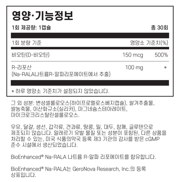 - Bio-Enhanced® Na-RALA 나트륨 r-알파 리포에이트의 r-리포산 100mg