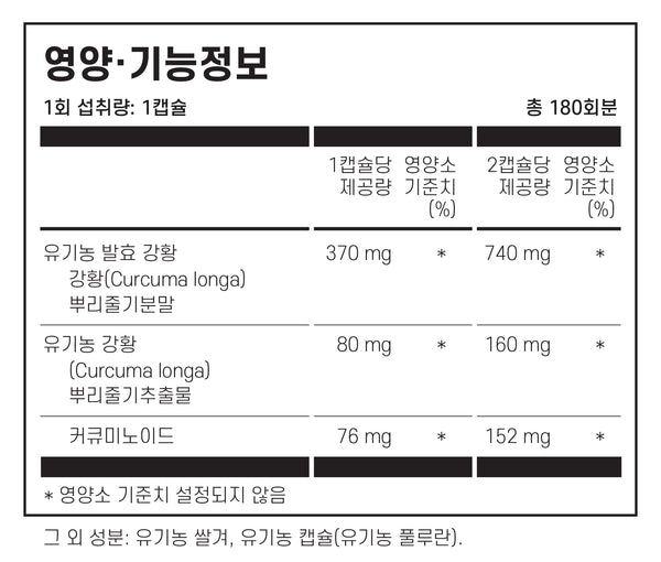 닥터 머콜라의 유기농 발효 강황은 두가지로 구성되어 있습니다. 최소 95% 쿠르쿠미노이드로 인증된 유기농 강황 추출물이 함유되어있고, 흡수력 향상을 위해 유기농 발효 강황을 함유 하고 있습니다.